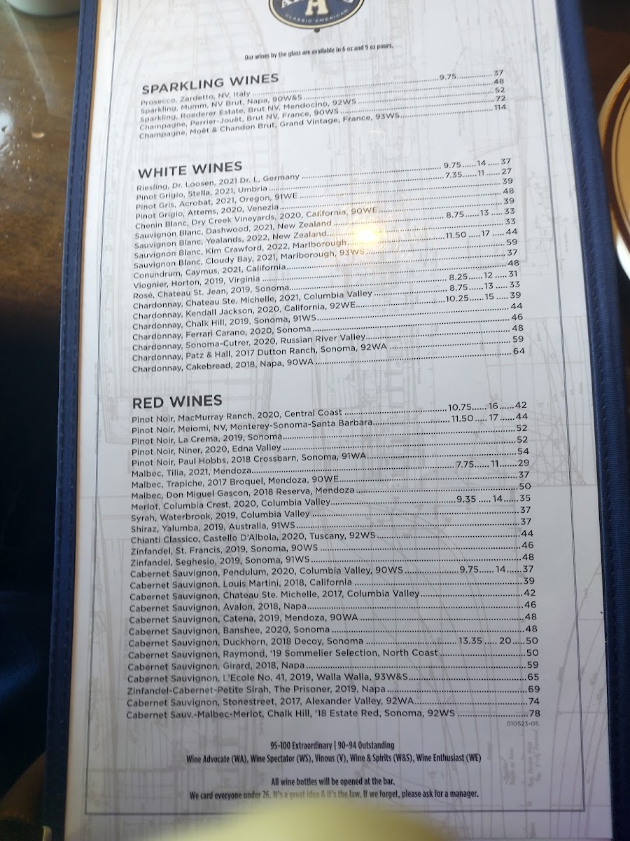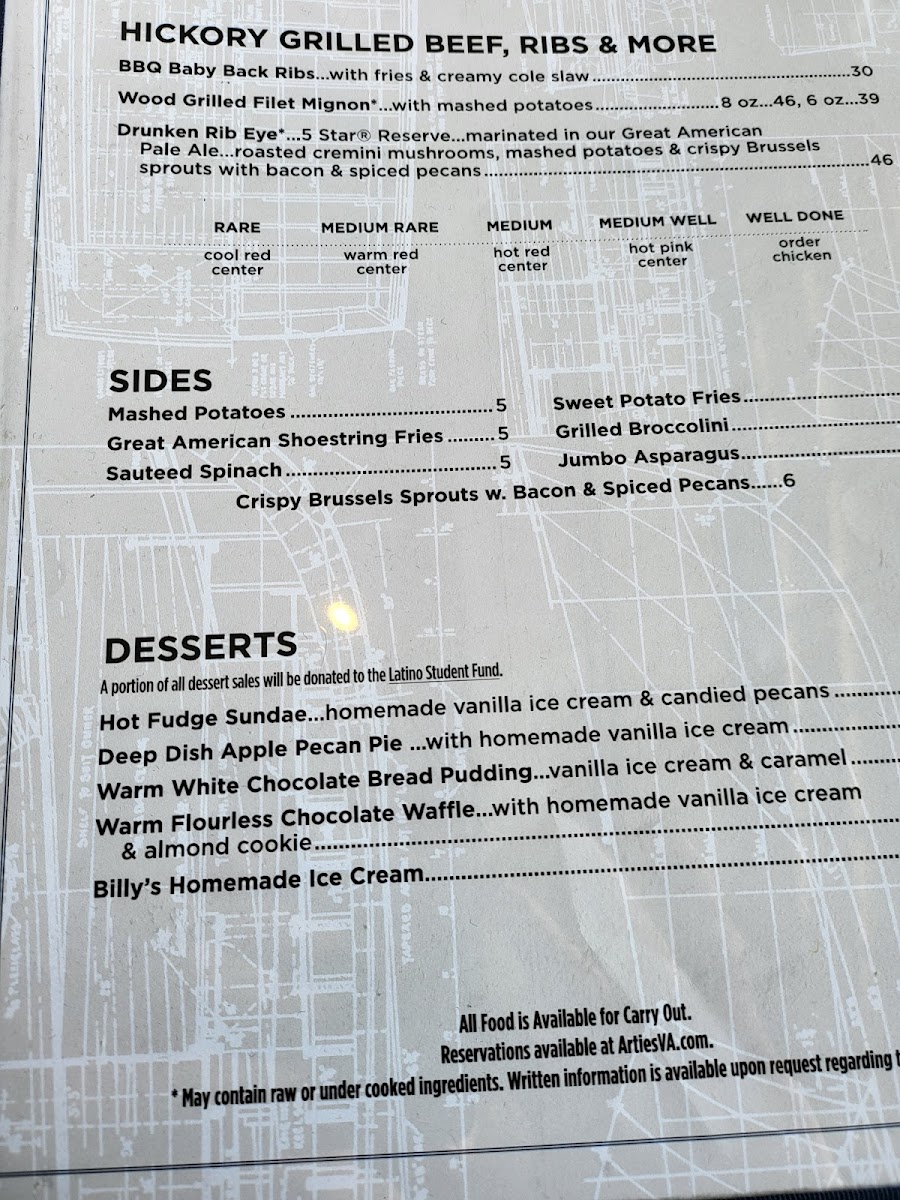 Sides: Sides are diverse and include mashed potatoes, sweet potato fries, fries dubbed Great American fries, grilled broccolini, sautéed spinach, jumbo asparagus, crispy Brussels sprouts with bacon and spiced pecans, and a loaded baked potato available during lunch service.