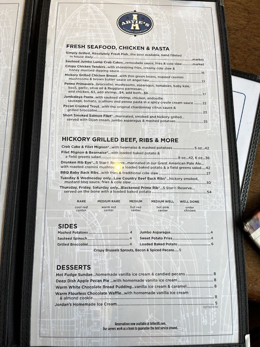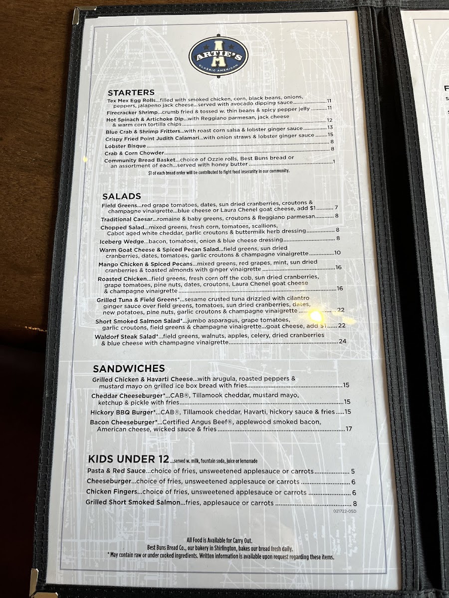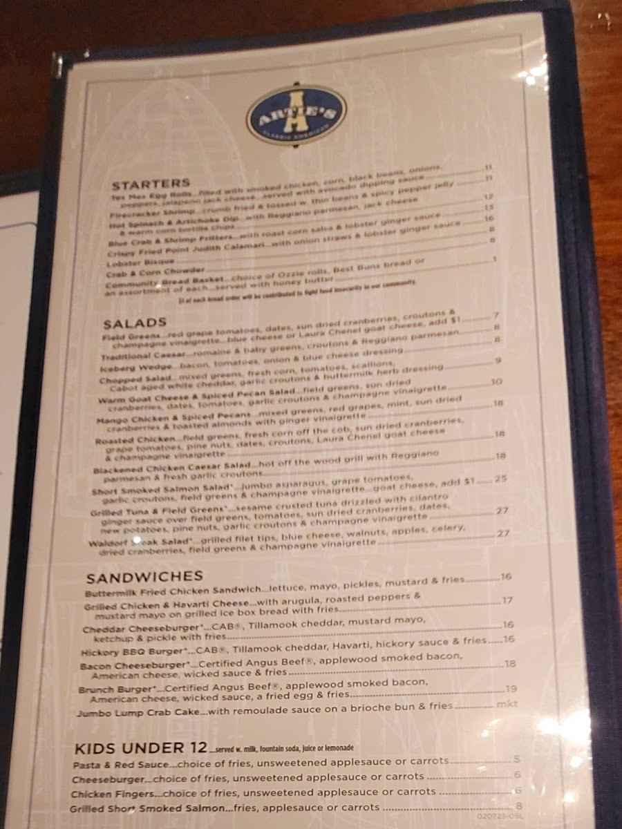 The menu at Artie's features a range of American cuisine with options suitable for lunch, dinner, and brunch. It is organized into several key sections, offering a variety of hearty entrées, sides, and desserts.