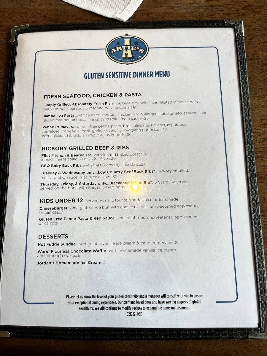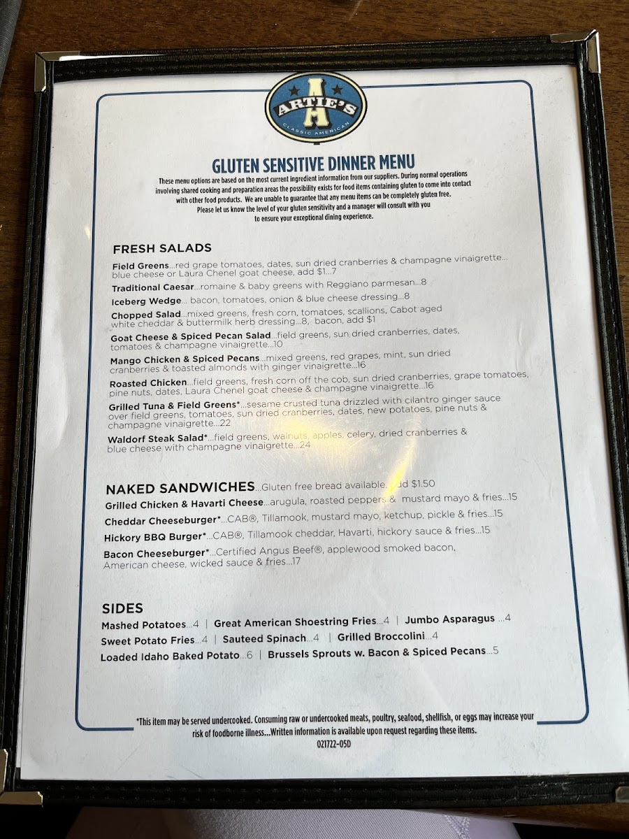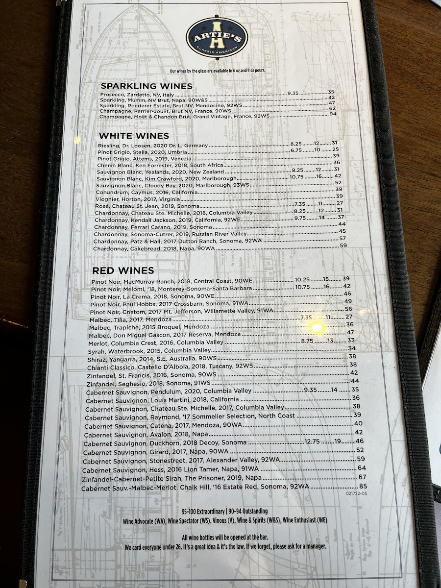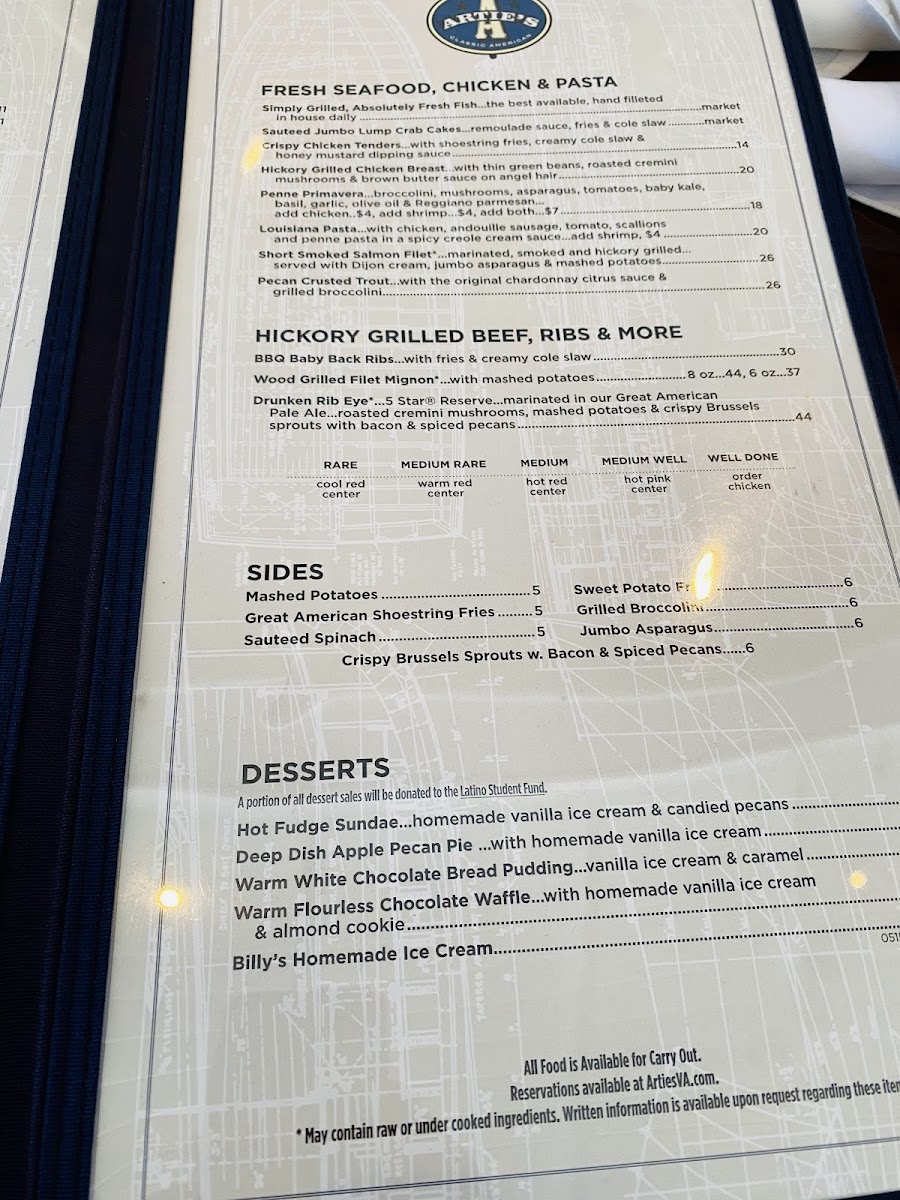 The menu at Artie's features a range of American cuisine with options suitable for lunch, dinner, and brunch. It is organized into several key sections, offering a variety of hearty entrées, sides, and desserts.